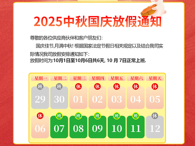尊敬的各位供應商伙伴和客戶朋友們:國慶佳節(jié),月滿中秋!國慶家園月圓人團園,國慶中秋雙節(jié)共歡騰!在此預祝大家度過一個輕松、愉快的假期.根據(jù)國家法定節(jié)假日相關規(guī)定,再結合我司實際情況,現(xiàn)將2025年國慶中秋節(jié)放假安排通知如下:放假時間定為10月1日至10月6日(星期三至星期一),共計6天.2025年 10月 7日(星期二)正式上班,假日期間如有業(yè)務需求可電話咨詢業(yè)務,感謝大家的理解與配合!秋高氣爽迎中